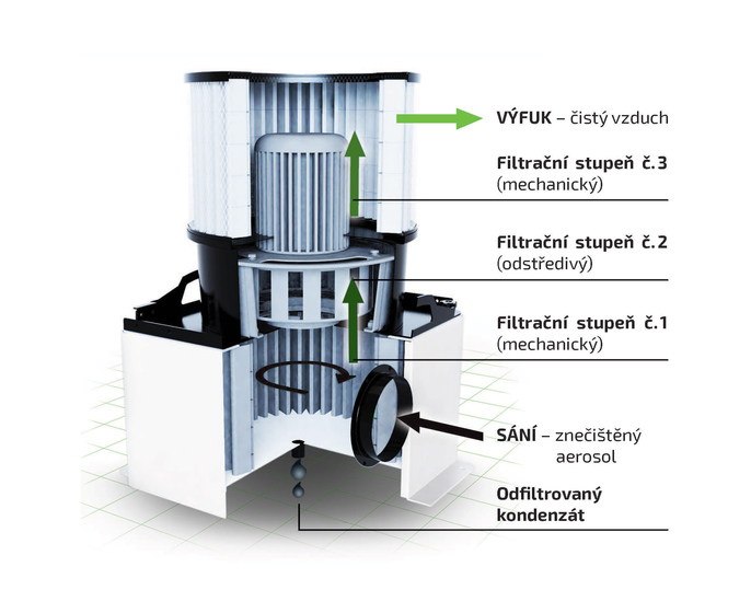 Filtrační stupeň č. 2 – je odstředivý s dokáže skvěle oddělit kapalinu od vzduchu – oddělená kapalina následně ve formě kondenzátu stéká na nespádované dno základní nádoby. Aerosol zbavený kapalné složky, tedy vzduch postupuje k závěrečnému jemnému dočistění do filtračního stupně č. 3.