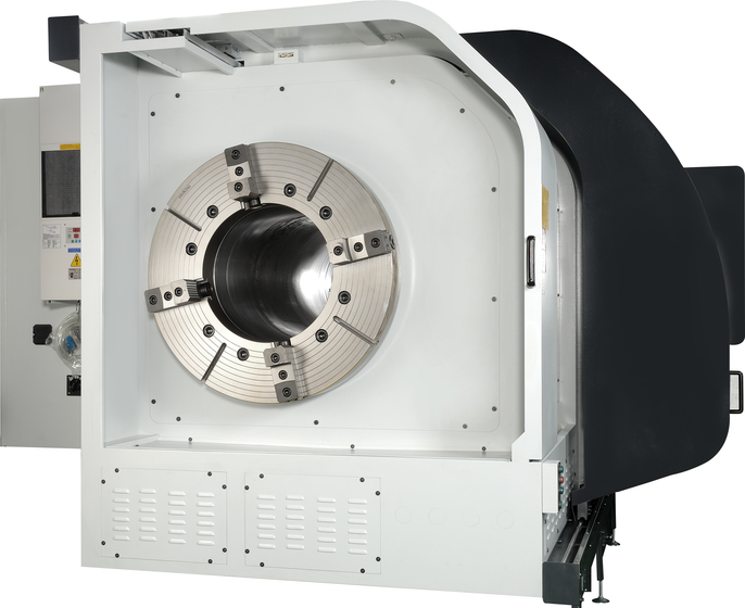 Obrázek zachycuje speciální provedení stroje se zadním sklíčidlem a velkým vrtáním. Provedení záleží na požadavcích uživatele.