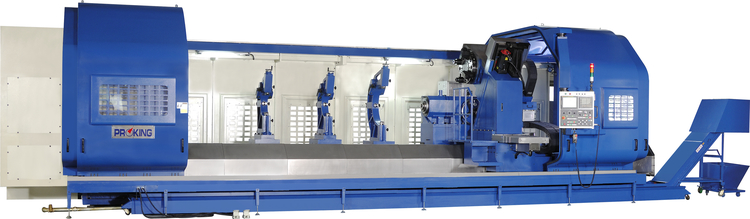 Doménou firmy PROKING jsou těžké soustruhy a z nich zejména soustruhy s rovným ložem. Výrobce tyto stroje produkuje celkem v 7mi modelových řadách a na obrázku zachycený stroj řady KAN už je pořádný „macek“ s vícedráhovým ložem se šířkou přesahující 1300mm. –